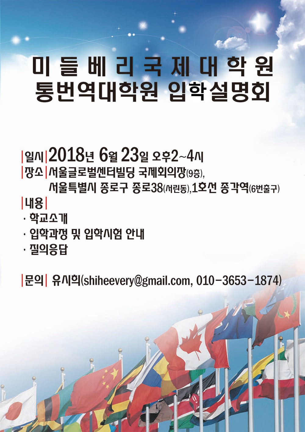 미들베리 국제대학원 통번역대학원에서 입학설명회를 다음과 같이 진행합니다. #일시: 2018년 6월 23일 오후 2시 ~ 4시 #장소: 서울 글로벌센터빌딩 국제회의장 (9층) 서울 종로구 종로 38 (서린동) #내용: 학교소개 / 입학과정 및 입학 시험 자세한 사항은 1:1 문의 또는 "shiheevery@gmail.com으로 문의해주시기 바랍니다. 감사합니다.